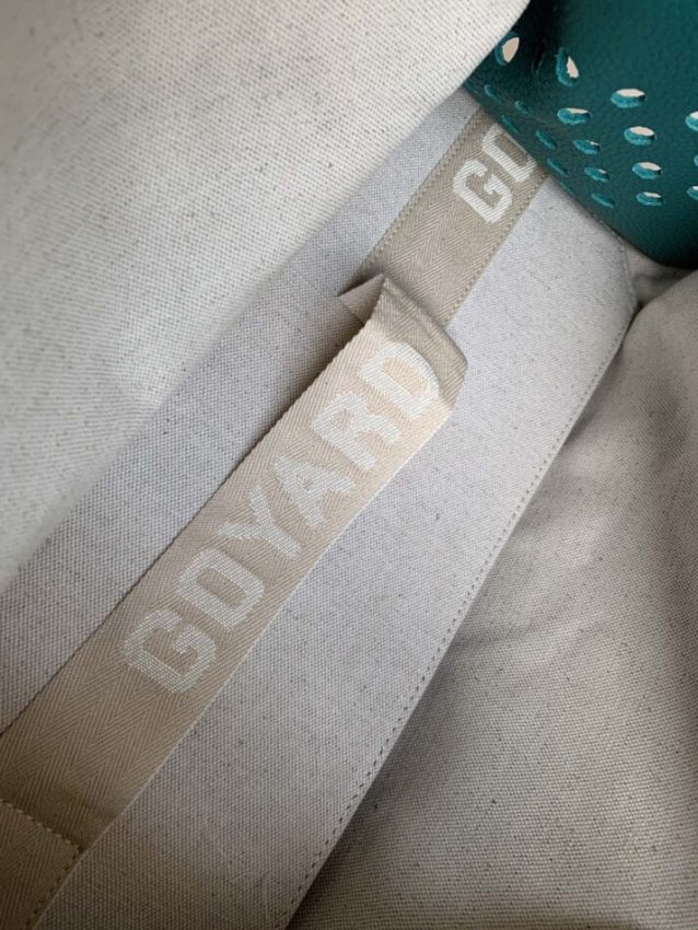 Goyardine coated canvas — Goyard’s proprietary material with the signature chevron dot pattern. The coating provides water resistance and durability while keeping the bag exceptionally lightweight. Clean, even stitching with careful attention to the leather trim joints. Thread color matches the trim for a seamless transition between materials. See real examples of our craftsmanship in our QC photos gallery.