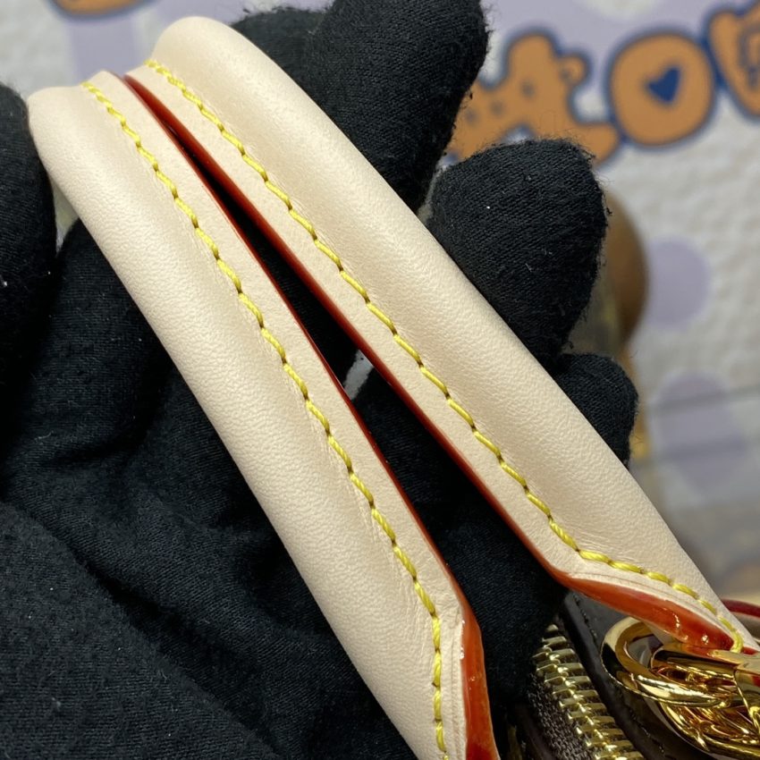 High-quality coated canvas forms the body of this piece — treated for water resistance and durability while maintaining the rich color and clean print alignment of the original. The iconic yellow contrast stitching runs with precision along all seams and trim panels. Thread tension is uniform, creating clean, visible stitch lines that are a key authenticity marker. Check our new arrivals to see the quality up close.