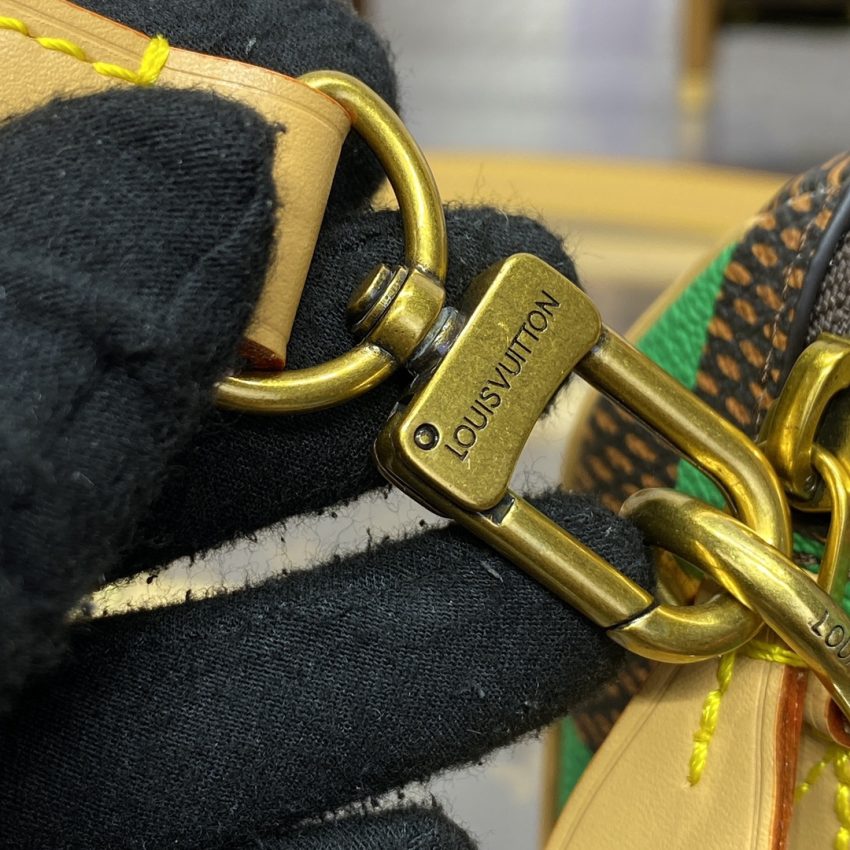 High-quality coated canvas forms the body of this piece — treated for water resistance and durability while maintaining the rich color and clean print alignment of the original. The iconic yellow contrast stitching runs with precision along all seams and trim panels. Thread tension is uniform, creating clean, visible stitch lines that are a key authenticity marker. Check our full catalog to see the quality up close.